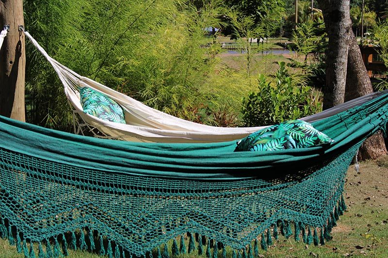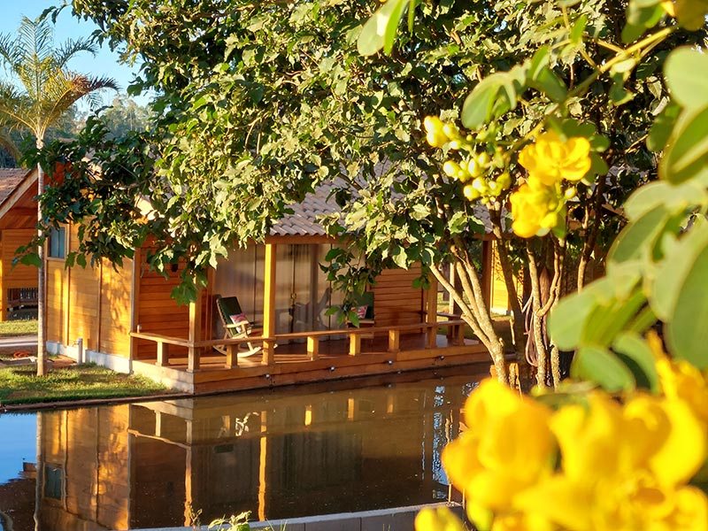 Ouvir o canto dos pássaros, ver os peixes darem seu show na hora da alimentação, interagir com galinhas soltas pela mata e ver brotar a água do olho d’água são algumas das maravilhas do Chalé dos Lagos Eco Resort.